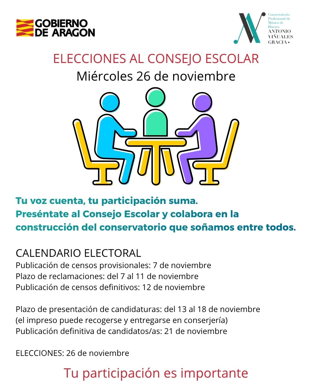 En los conservatorios profesionales de música el consejo escolar debe renovar todos sus miembros cada dos años, y el procedimiento de elección de sus miembros ha de desarrollarse en el primer trimestre del curso. Este año las elecciones se celebrarán el miércoles 26 de noviembre. Los censos provisionales pueden consultarse en el tablón de anuncios del centro del 7 al 11 de noviembre (en el vestíbulo de entrada).